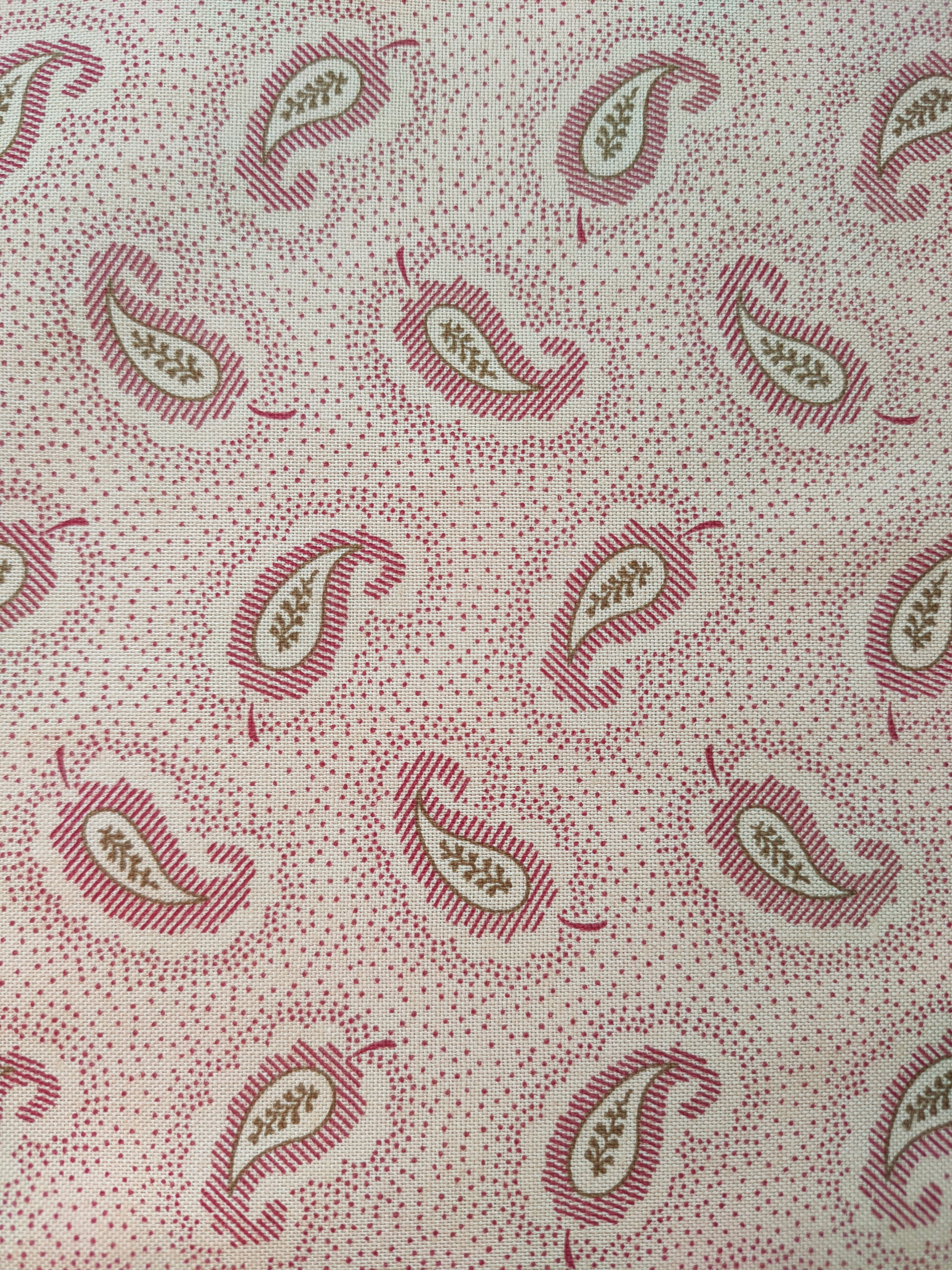 100% cotton. Fat Quarter. Red and brown paisley pattern on a beige background.