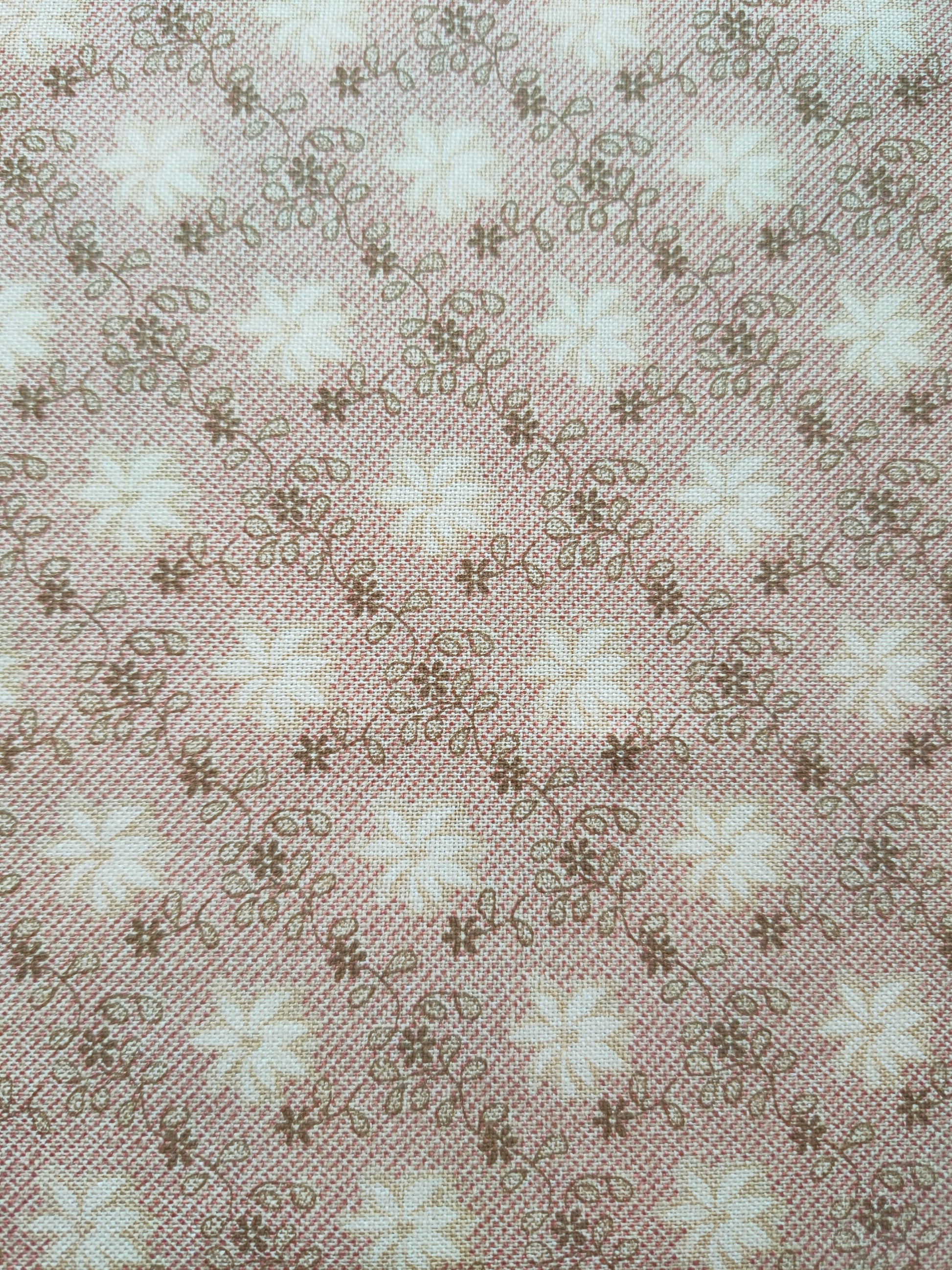 100% cotton. Fat Quarter. Beige leaf pattern on a spotty beige and brown background.