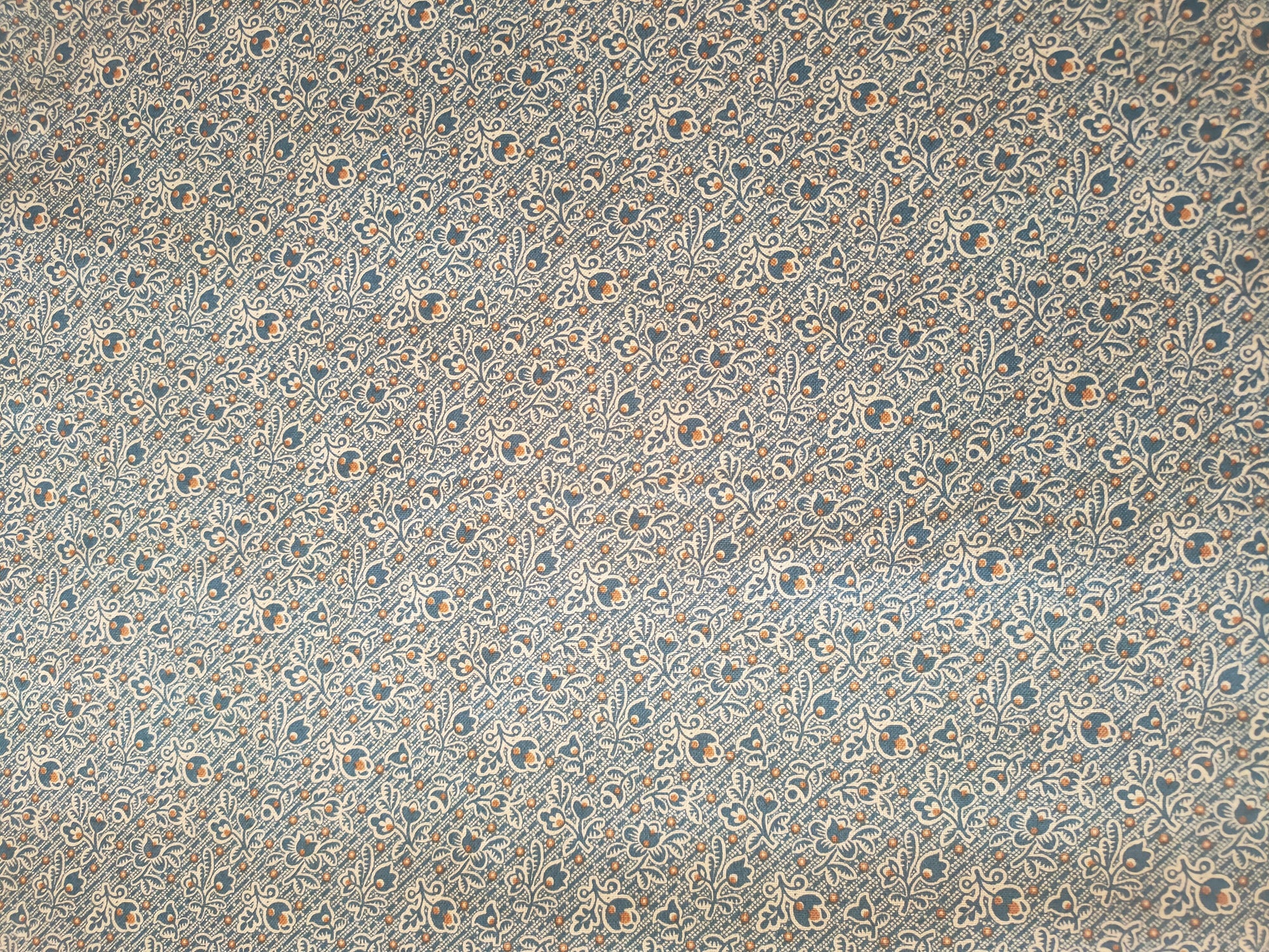 100% cotton. Fat Quarter. Beige and tan flower pattern on a blue background.